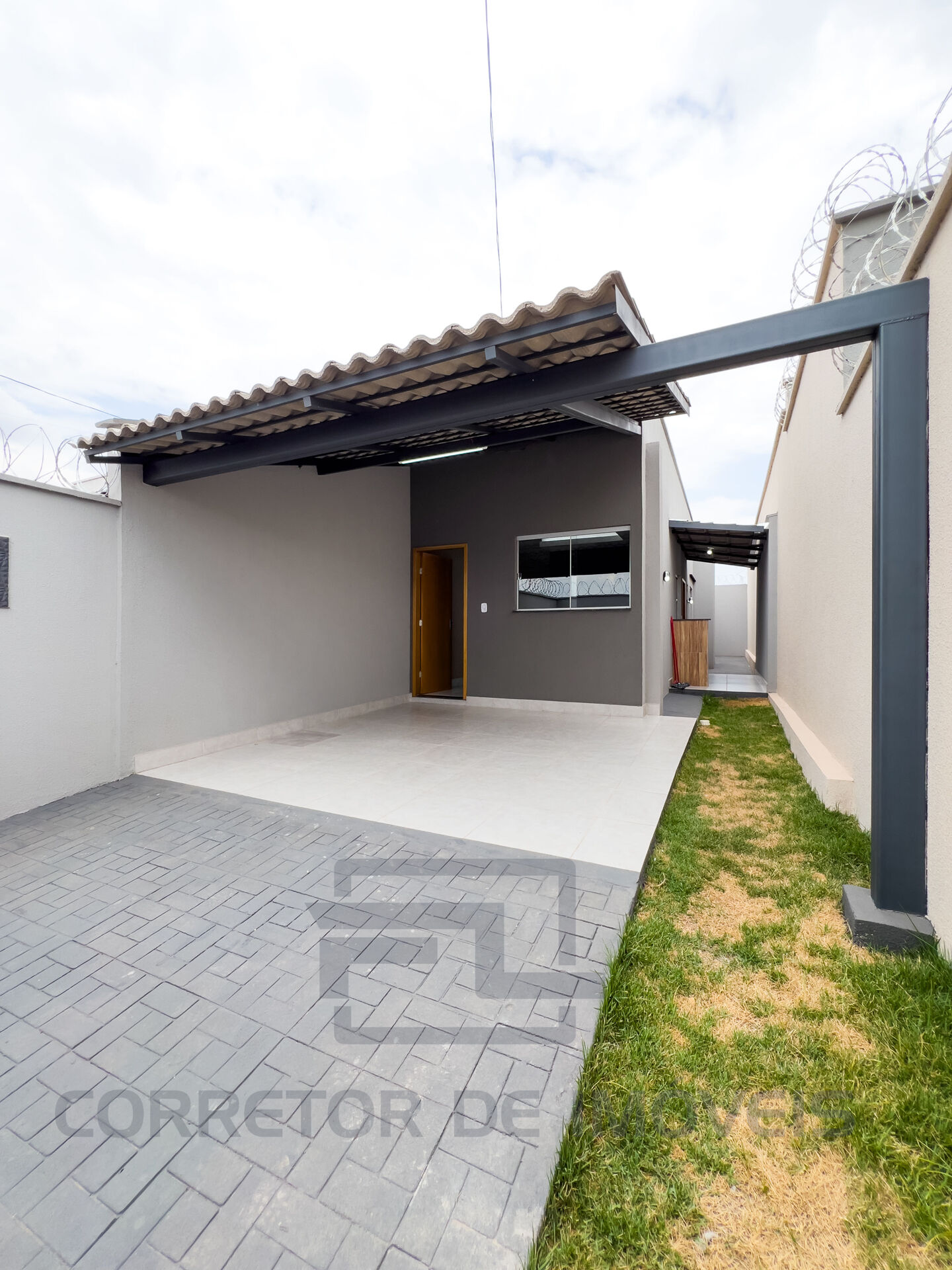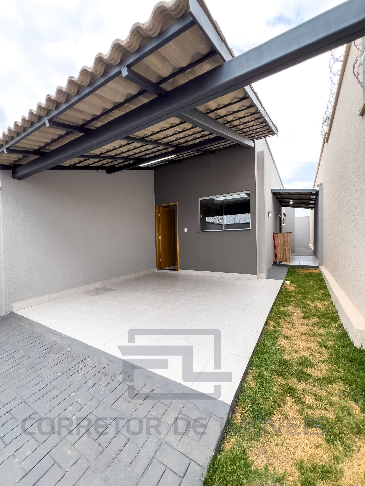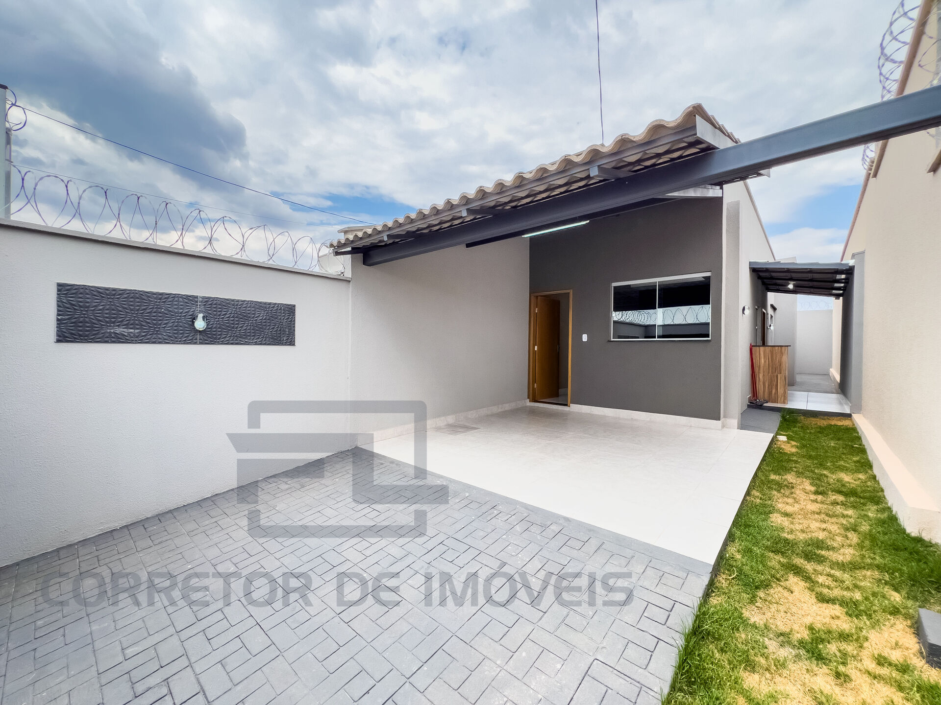 Casa com dois quartos, sendo uma suíte, sala, cozinha, Banheiro social, Área de serviço e Garagem coberta.